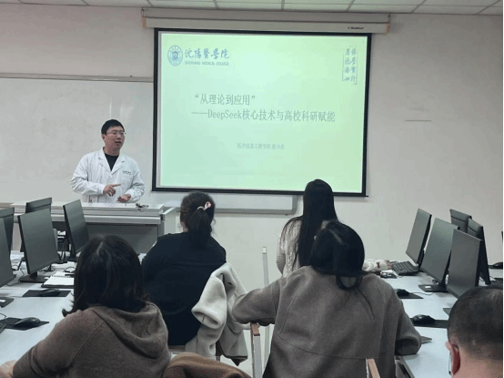 会议伊始,信息工程教研室殷书彦老师作《从理论到应用:DeepSeek核心技术与高校科研赋能》专题报告,系统讲解了DeepSeek的技术特性与教科研应用潜力。殷老师介绍,DeepSeek提供V3和R1两种模型,分别适用于快速生成与深度推理任务,数据更新分别覆盖至2024年7月和2023年10月,同时支持联网搜索功能,例如可实时获取最新临床指南与药物信息。此外,DeepSeek支持本地化部署,确保数据安全与服务稳定性,并可通过重新训练与挂载知识库(RAG)实现医学领域的定制化应用。